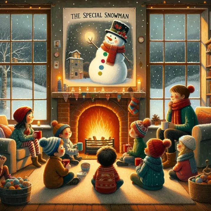 In the heart of a snowy village, children gathered to build a snowman. Each child wanted to add something different. Mia brought colorful buttons, Liam found a quirky hat, and Aiden offered a bright scarf. They named him “The Special Snowman.”